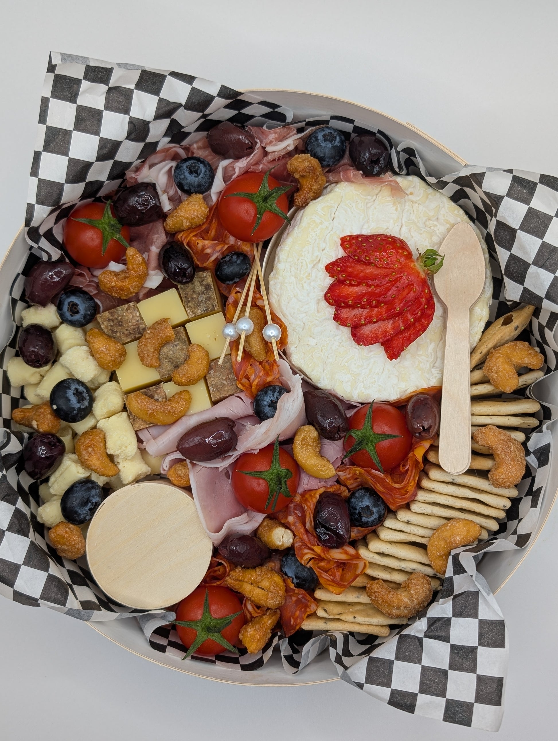Comté 24 mois d’affinage, Saint Félicien de la Mère Richard, Bouchon de vache fromagerie Gérentes, Jambon sec 12 mois - Maison Villani, Spianata piccante - Maison Villani, Jambon cuit - Maison Villani, Olives, Taralli aux oignons, Noix de Grenoble, décoration de fruits et légumes frais et bio de saison, miel d’acacia - Les ruches de Max