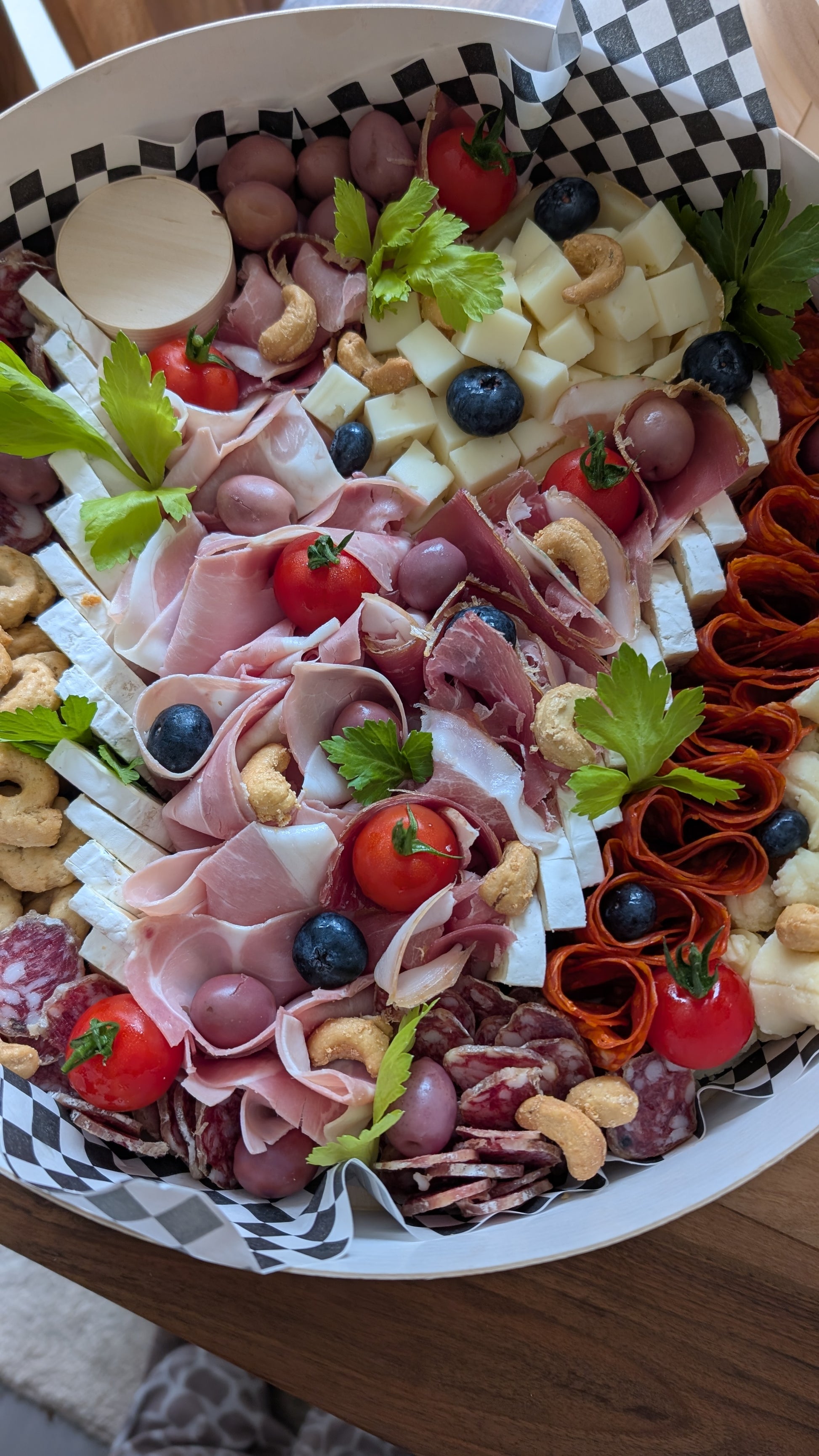Tomme de brebis - fromagerie Duroux, Bouchons fermiers de chèvre - Christophe Brun, Bleu d'Auvergne Bio - fromagerie Duroux, Jambon sec 12 mois - Maison Villani, Jambon cuit - Maison Villani, Saucisson sec de Haute-Savoie tranché, Olives, décoration de fruits et légumes frais et bio de saison, miel d’acacia - Les ruches de Max, Taralli aux oignons